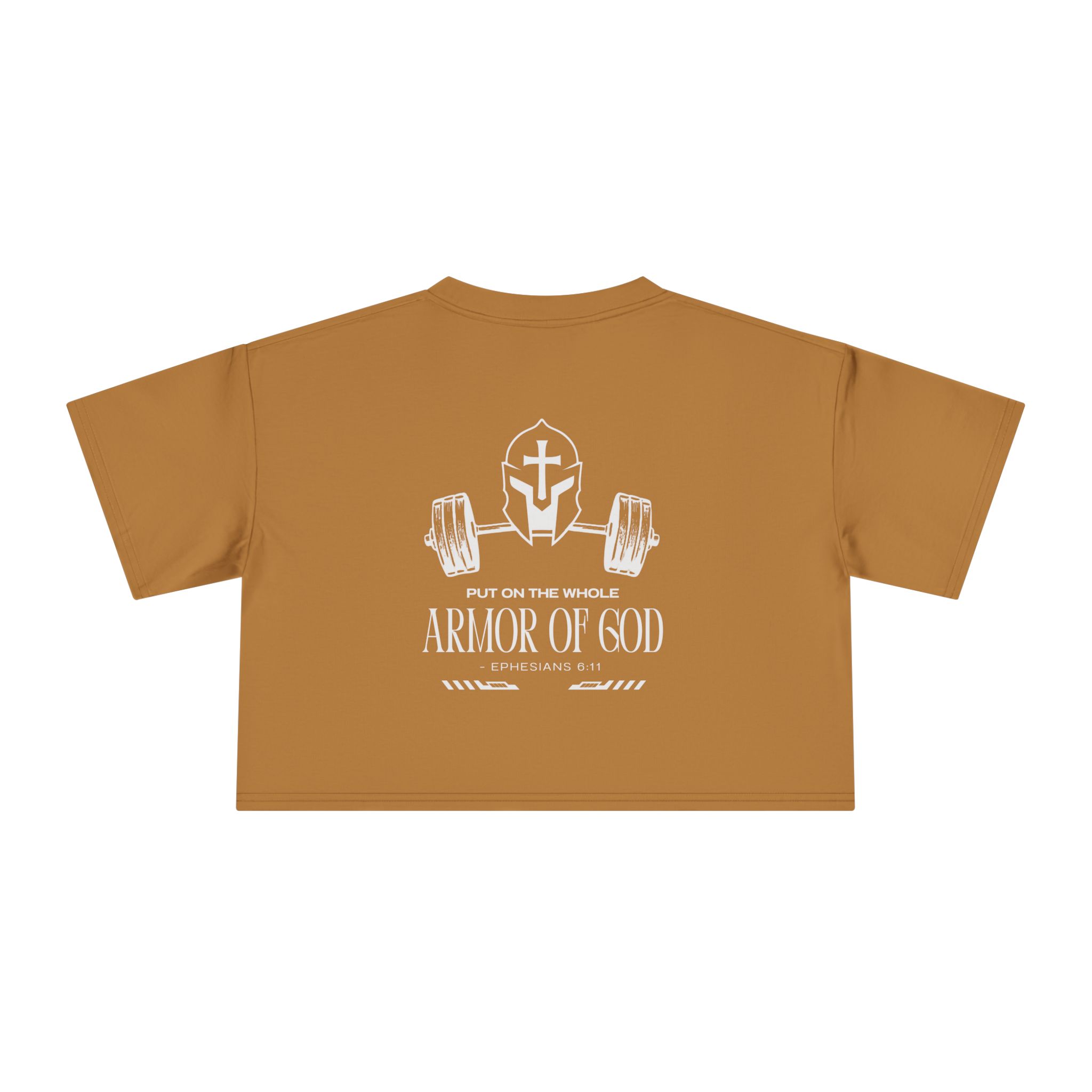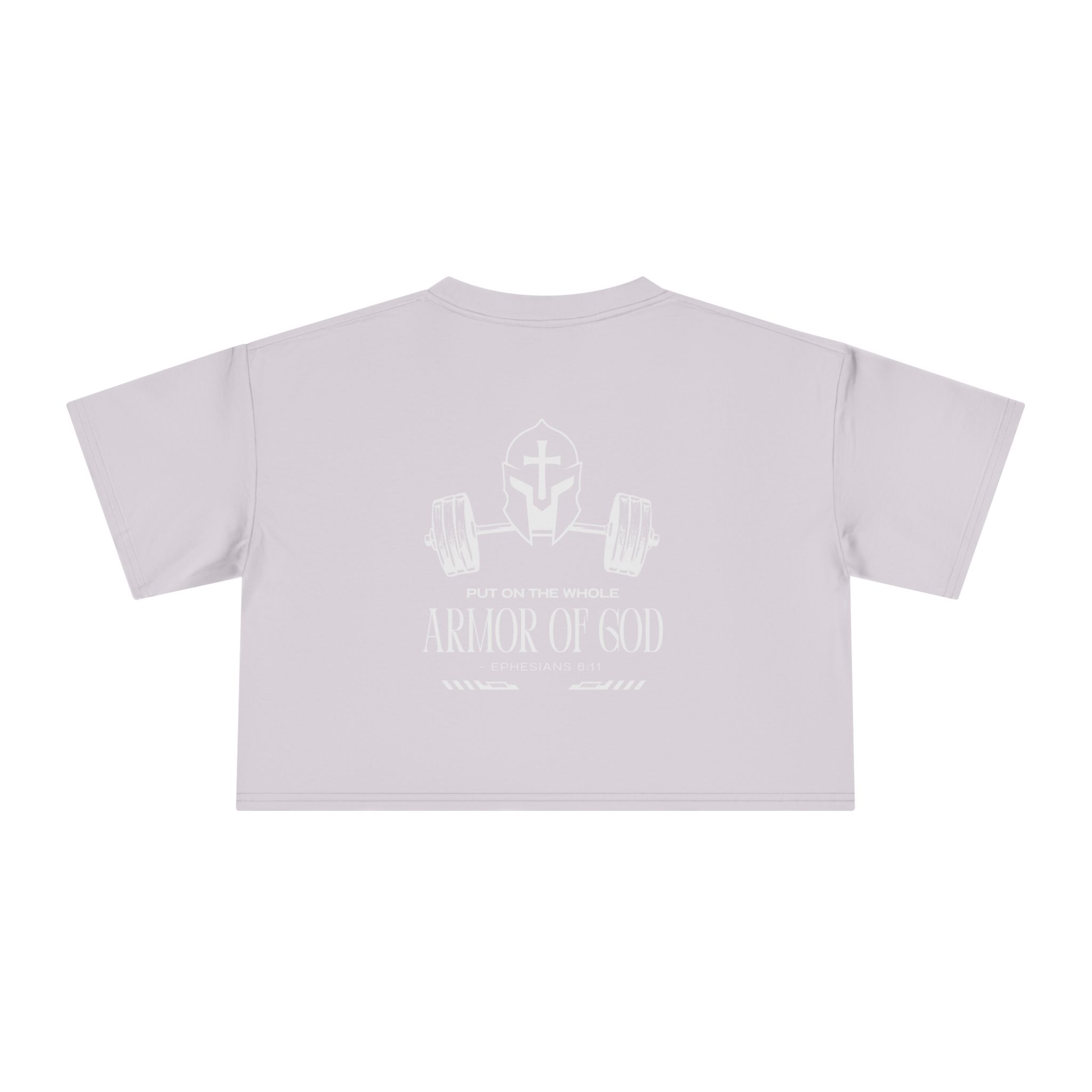 A cropped, relaxed tee made to move with you. The medium-weight cotton drapes soft and steady across the shoulders while the dropped-sleeve cut gives a laid-back, modern silhouette. A subtle chest emblem keeps the front clean, while the back carries a bold, faith-forward graphic.